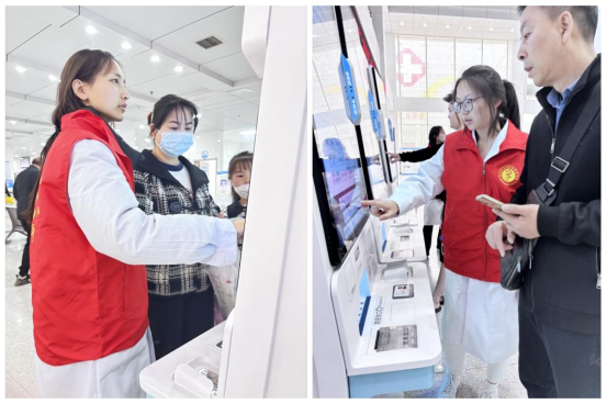 上午8点,志愿者们便身着统一标识马甲,分散在医院门诊大厅、挂号处、候诊区等人流密集区域。“阿姨,消化内科在3楼,我带您去电梯口!”。志愿者周萍贴心问道,“叔叔,您要挂什么科室?,我帮您操作。”志愿者们耐心解答患者疑问,协助操作自助设备,疏导排队秩序。面对老年患者,他们更是主动上前,一对一陪同就医。一位独自就诊的阿姨连连称赞:“这些孩子热情又细心,让我省心多了!”