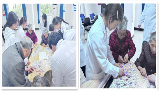志愿者们还为爷爷奶奶精心准备了拼图小游戏,他们耐心陪伴爷爷奶奶,手把手指导技巧,一边拼图一边聊天。董奶奶说:“这还是我第一次玩拼图游戏呢” 。老人们专注投入,成功拼出图案时开心得像个孩子。小小的拼图不仅锻炼了动手能力,更让老人们感受到陪伴的温暖。